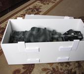 Решил делать сам. Благо опыт в этом есть. На работе выпросил остатки ПВХ, взял “супер-клей” Cosmofen СА12 и сделал точно по размерам. Коробка получилась достаточно легкой и крепкой. Вес 2.2 кг. Внутри вставки из поролона и модель фиксируется четко. От покраски модели осталось немного краски и грунта. Аэрографом запылил в стиле “камуфляж”. Получилось не очень хорошо, но лучше, чем белая коробка. Сделал ремни, для транспортировки на дачу.