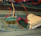 На улице дождь, сначала начинаю устранять неисправности а их пока обнаружена одна - то работает то не работает поднятие-опускание ствола пушки. после разборки обнаружил обрыв дорожек у выводов разъёма на маленькой плате. Был не правильно впаян разъём, пластмасса не легла на плату и при состыковке разъёмов контакты сдвинулись и оторвали фольгу дорожек от платы. И ещё еле держался провод к светодиоду пушки, чуть тронул он и отвалился. Качеством пайки не пугайтесь, плата промыта спиртом ( не парами😁) и канифоль удалена. За одно и перенёс выключатель с брюха в попу, удобно и не видно. Начинаю делать автономный модуль FPV который будет устанавливаться на башне, пока думаю сделать крепёж магнитами.