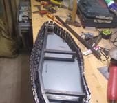 Ещё доваривал направляющие-ограничители, которые должны удерживать гусеницу от рысканья… Если честно - это, наверное, перестраховка… Первоначально то была мысль, что сами ролики будут удерживать гусеницу “на курсе”. Но одолели сомнения, что выступами осей цепей гусеница будет щёлкать по боковым поверхностям роликов… Решил, что лучше им скользить по плоскости направляющей. Да и в верхней своей части гусеница должна по чему то скользить… Сначала рассчитывал, что она ляжет на боковины понтонов. Потом получилось так, что она может справа или слева провалиться внутрь. Не глубоко, конечно, но всё равно - не приятно.