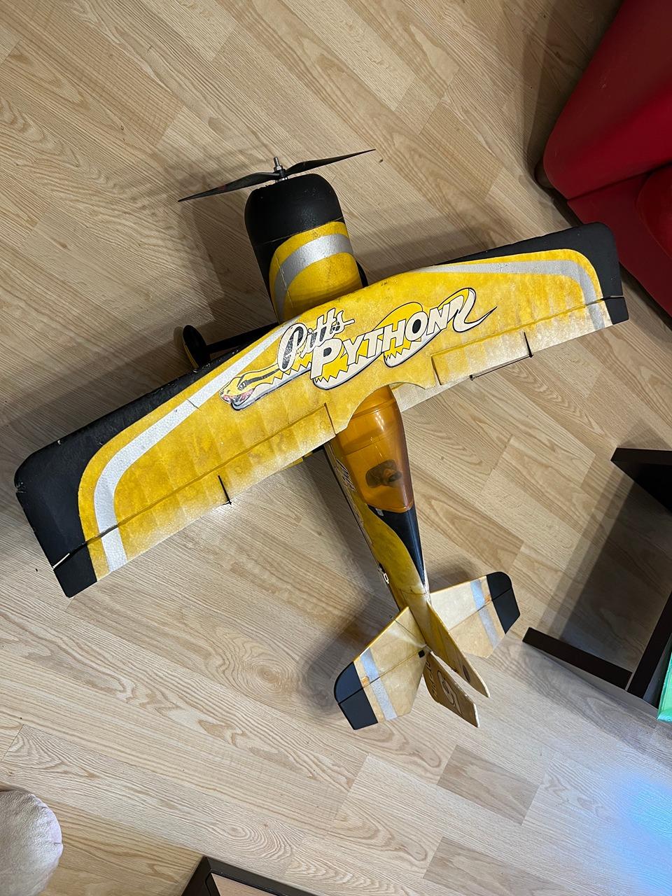 Состояние самолета видно на фото. Пыльный, краска побледнела от солнца. Была пара мелких ремонтов (шасси вклеивалось обратно и подобные мелочи). Сервы моторы есц не горели не менялись не ломались.