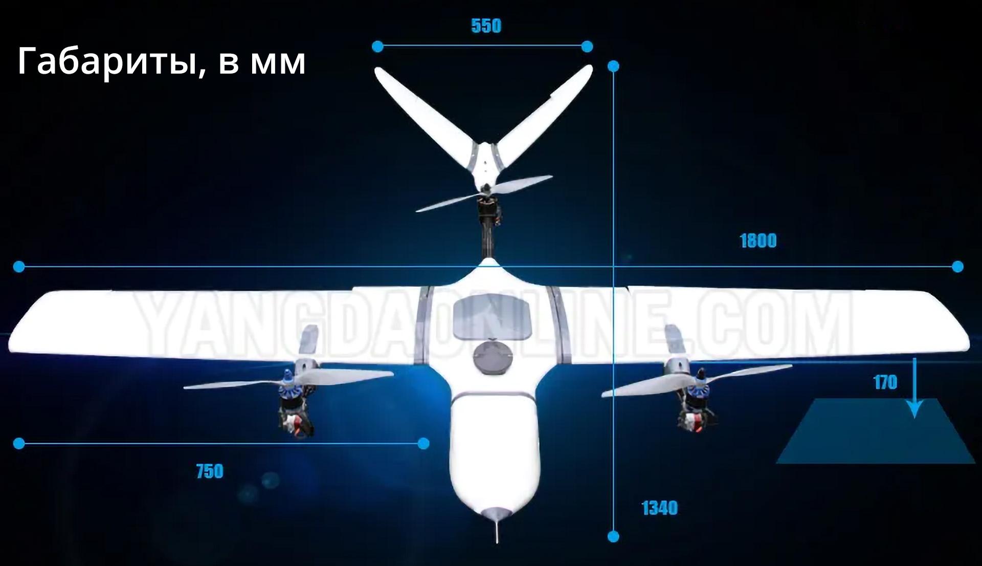 Быстросборная модульная конструкция, крыло и носовая часть на быстросъемных соединениях, очень удобно в использовании. Батарейный отсек для максимум 6S 10000mAh литий-полимерной батареи, длительность полета в самолетной версии до 2,5 часов, в версии с вертикальным взлетом до 1+ час Название бренда: MyFlyDream (MFD) Наименование товара: Nimbus Размах крыльев: 1800 мм Длина: 1300 мм Макс. Высота полета: 3500 м Максимальная скорость полета: до 110 км/ч Макс. взлет Вес: 4,8 кг Макс. грузоподъемность: 0,8 кг