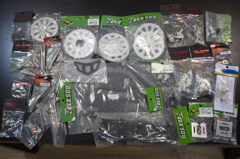 Несколько комплектов новых лопастей ОР, 2 комплекта хвостовых балок и валов, 3 запасных канопи, шасси, 2 запасные цифровые сервомашинки на АП (Emax ES9258), все ходовые расходники и запчасти.