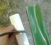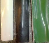 Смола вместе с отвердителем оказалась очень жидкая, пришлось наносить ее при помощи краскопульта, продувалась легко при 3-4 атмосферах. Сначала просто обдул небольшую матрицу смолой, затем положил сверху углеткать 250 г/м, затем еще раз обдул и положил стеклоткань Т-13, и еще раз обдул. Эффект был как сухая белая рубашка на мокрое тело, смола очень быстро пропитывает ткань. Через 40 минут смола стала резко густеть. В вакууме клеить пока побоялся, уж очень жидкая, как бы насосы не откачали еще и смолу из мешка.