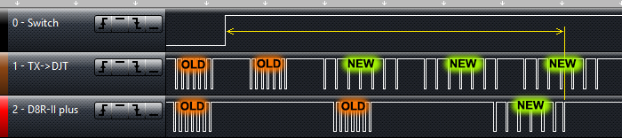 Я взял логический анализатор, подключил один канал к тумблеру на аппе, второй канал ко входу передающего модуля FrSky DJT (который на задней стороне аппы), а третий - к SBUS выходу приёмника X8R. Все каналы на аппе я назначил на этот тумблер.