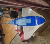Вес под 800 грамм а площадь суммарная около 24 кв.дм . Управляю практически только движками. Они у меня на боковые крутилки подвешены. Когда на экране, то нос опускает, как собака по следу. От маленьких волн нос отскакивает, благо плоскодонка. Был нос по корабельному, то кувыркался через оный.