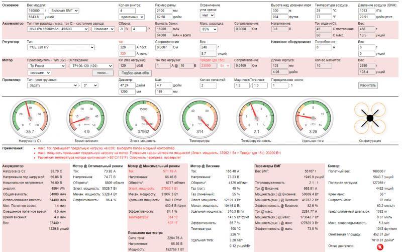 Да, понятно, что разброс в цифрах сейчас есть серьезный, но когда я подбирал параметры в xcopterCalc, я хотел всего лишь понять соотношение параметров ВМГ, аккумов, их количества, массы, но, к сожалению, пока я уперся в такую штуку.