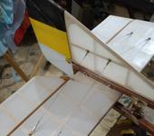Клеил то же эмалитом. Сначала пробовал зафиксировать циакрином ткань. Результат не понравился, заметны места фиксации. В конечном итоге сначала по периметру приклеивал эмалитом, “пришкваривая” утюжком. Потом натягивал феном и после этого проклеивал по нервюрам, лонжеронам. После того как клей высох эмалитил. При нанесении первого слоя есть вероятность затекания эмалита на внутреннюю поверхность и образования капель там, поры ткани еще “не заималичены” . По этому надо стараться очень быстро растирать, не задерживать кисть.
