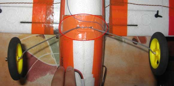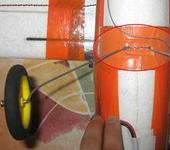 Вот: индикатор бортового питания (припаян напрямую к регулятору), БАНО, решенная проблема с выдеранием с мясом стойки шасси (вклеил клеем, а снаружи слой армированного скотча, а потом цветного скотча), большие колеса (сирйку шасси, как видите почти не гнул и никуда не переставлял).