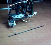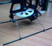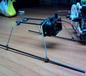 Первыи вариант(с белым кондуктором аккума) со смещенным назад аккумулятором. Обрезал держатель аккума от сломанных шасси. Приклеил его на термоклеи к двум полоскам карбона 0,8*1,2мм в сечении (стеклопластика от плат, жесткой пластмассы, текстолита и т.п. -включите фантазию) Размазал паялом клеи на держателе и полосках, сложил и прогрел место стыка паяльником через карбон (осторожно- не сожгите смолистую составляющую карбона). Долго думал из чего сделать «ноги». Мои из жилы струны №100 для бас-гитары (самая толстая от обычнои шестиструнки- тонковата). Подойдет от пианино и т.п. Скручиваем оплетку со струны и прочная, жесткая проволока у нас в руках. Кстати она луженая так что её можно паять. Загнул два одинаковых элемента передних и задних «ног» с петлей для вставки в раму . Не забыл, что левые части несколько длиннее правых т.к. на лыжах не будет наростов как на стоковых хотя это не существенно. Дальше свернул колечки на концах для крепежа лыж из прутка карбона диам. 1,2 мм (ватных палоче, стержнеи от шариковых авторучек) и запаял термоклеем. Термоклеи, нитки, по ниткам циан. Конструкция НЕУБИВАЕМА. Вес -1,79 грамма против 1,54гр у стоковых. Да, придется удлинить и закрепить на раме провода но это и так ясно.